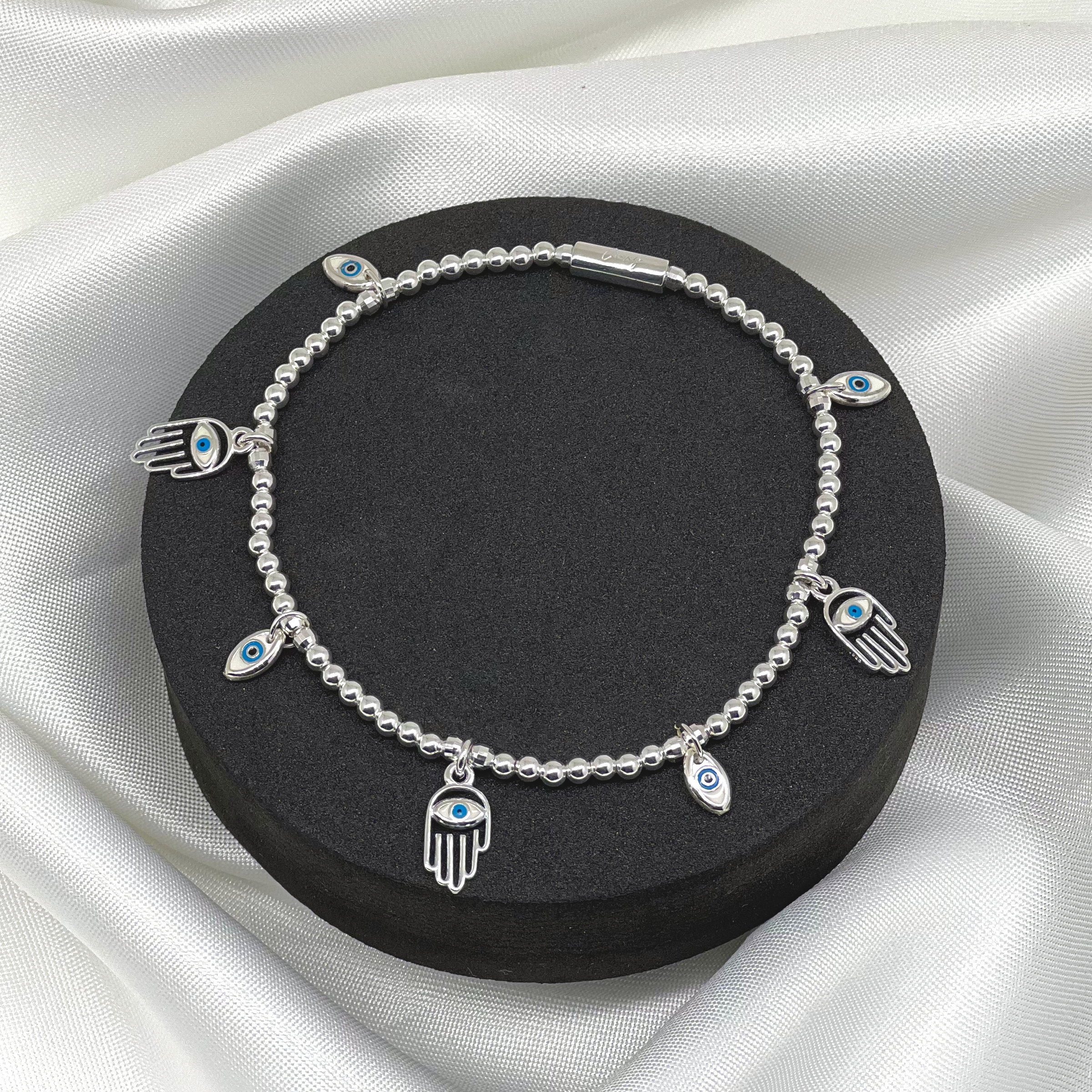 A new addition, our Vivante Hamsa Eye anklet protects the wearer from evil eye, and provides good fortune, health and happiness.